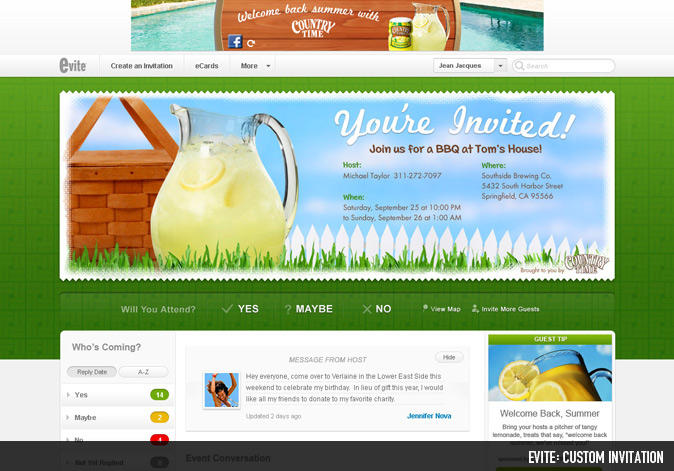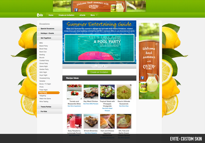 Country Time also sponsored Evite's Summer Entertaining Guide with a custom-designed skin. The Summer Entertaining Guide offers a wealth of summer party planning tips, recipes and video content that Evite users crave.