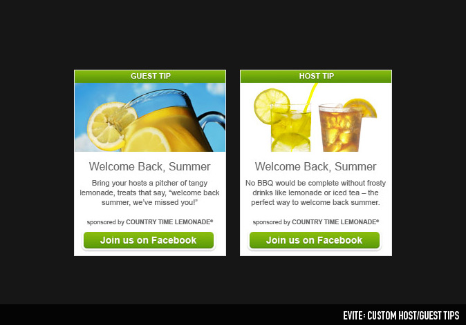 We created a custom-designed Evite invitation for the campaign, as well as host and guest tips promoting Country Time's Facebook app—all aligned to the "Welcome Back Summer" creative, giving Country Time a cohesive brand experience on Evite.com.